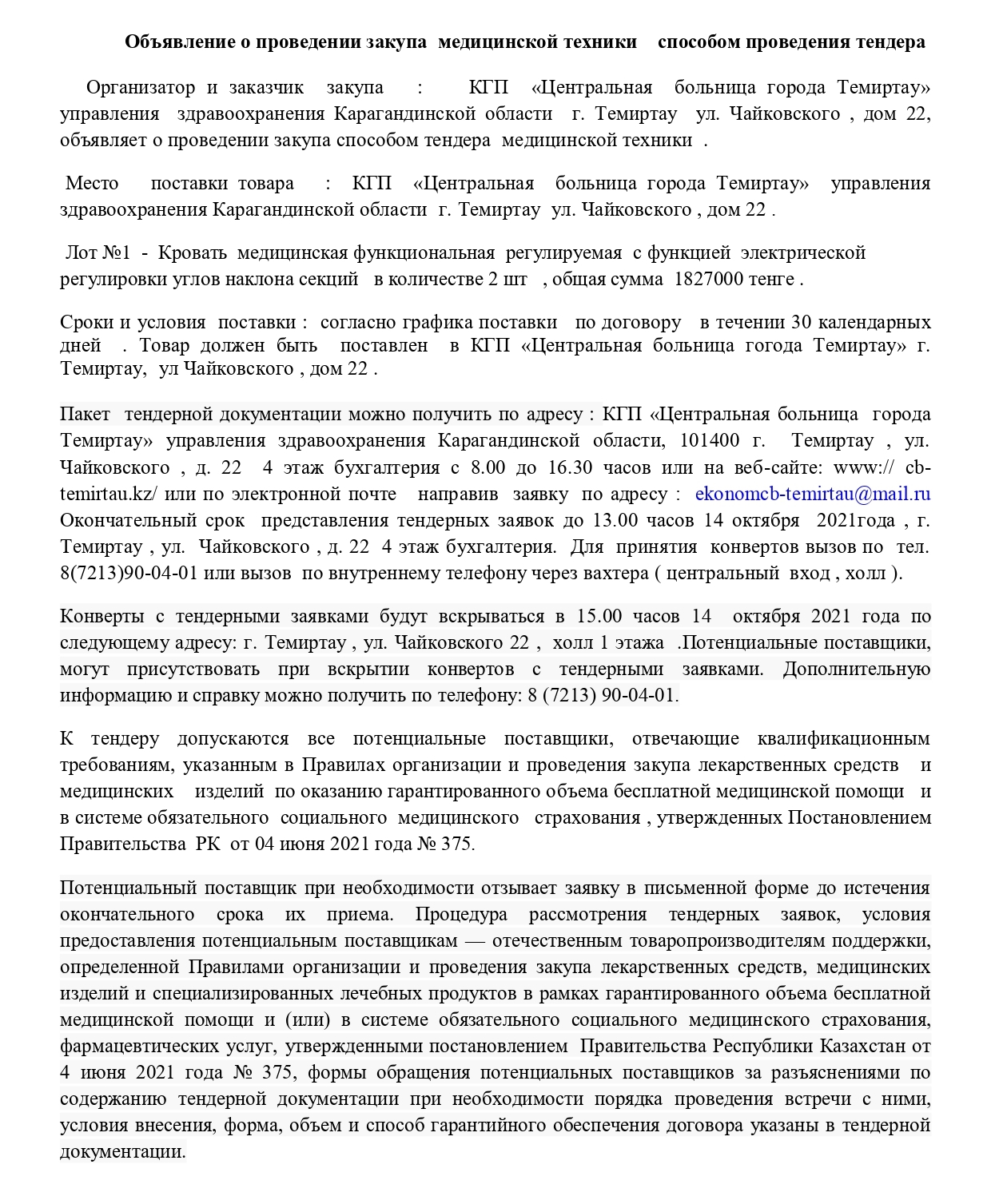 21. Объявление о проведении закупа медицинской техники способом проведения тендера. (24 сентября 2021 года) (2)
