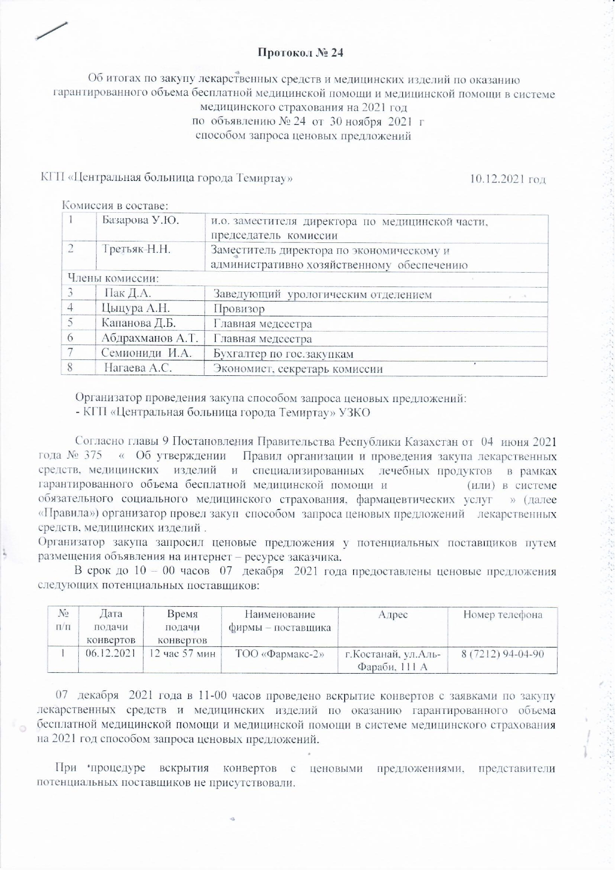 24. Протокол №24 от 13.12.2021 (по закупу медицинских изделий способом запроса ценовых предложений)