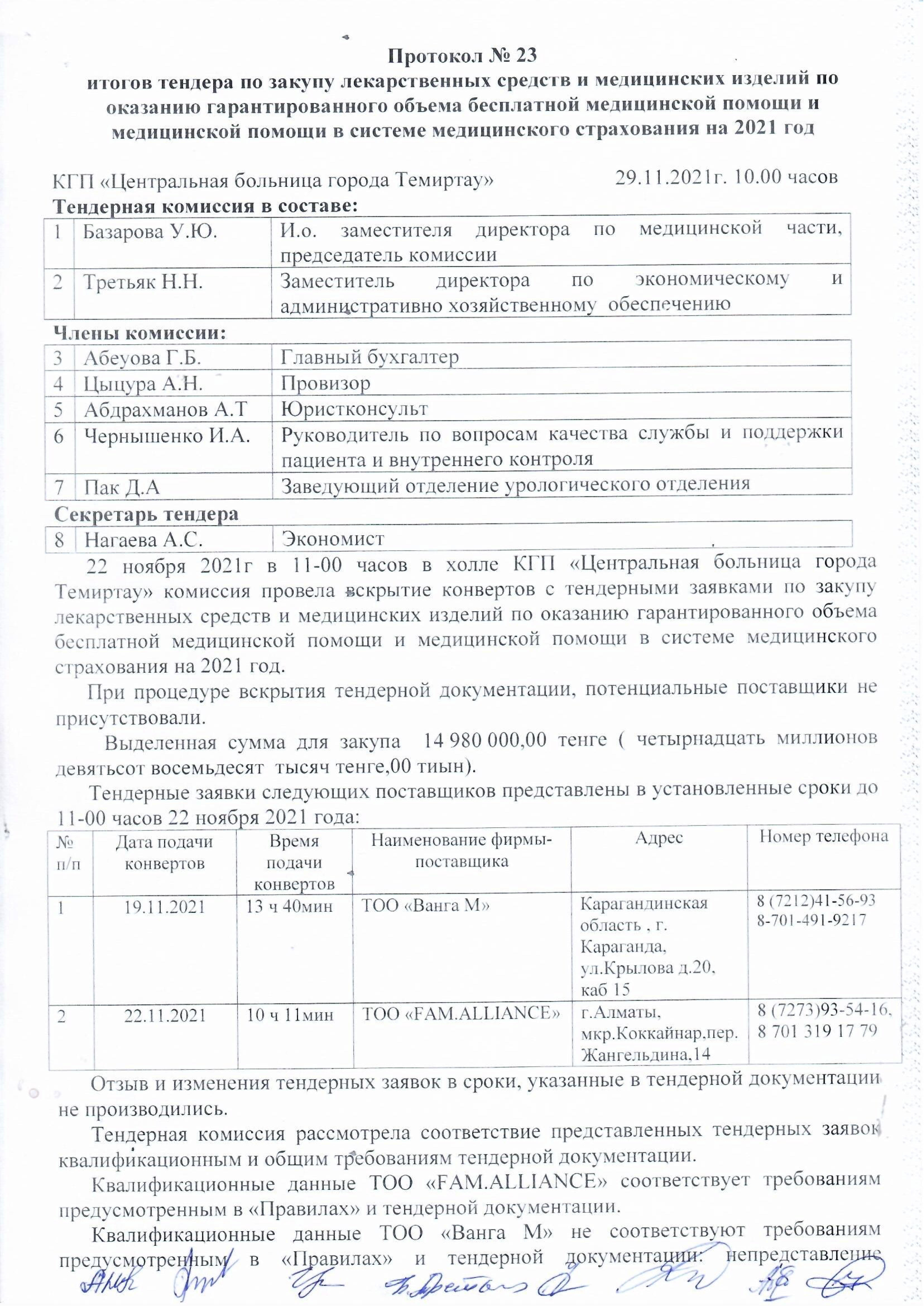 23. Протокол №23 от 03.12.21 (о проведении закупа лекарственных средств , медицинских изделий способом проведения тендера. )