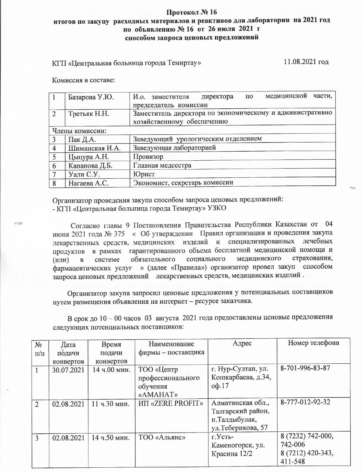 16. Протокол №16 от 13.08.21 (о закупе расходных материалов и реактивов для лаборатории способом запроса ценовых предложений)
