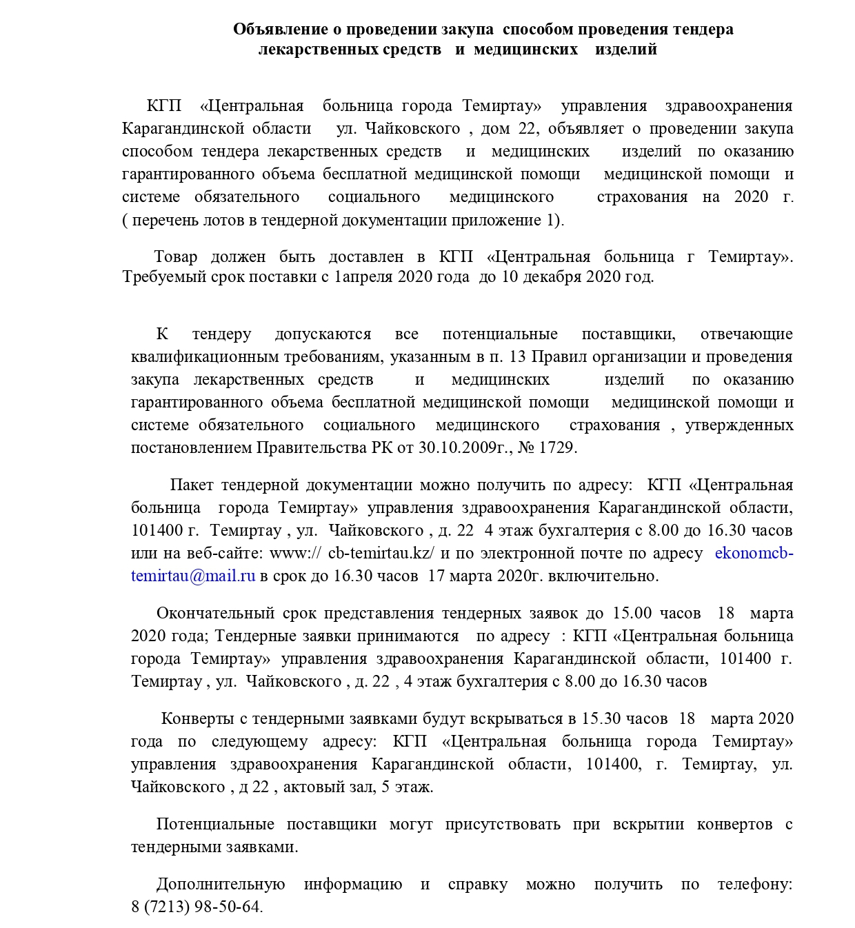 4. Объявление о проведении закупа способом проведения тендера лекарственных средств и медицинских изделий. (27 февраля 2020 года)