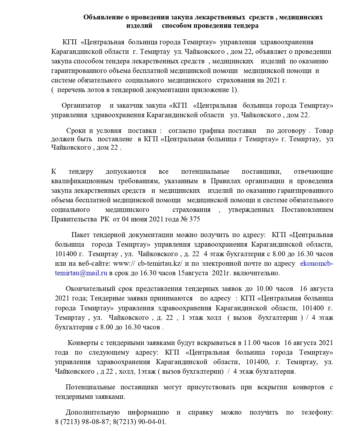 19. Объявление о проведении закупа лекарственных средств , медицинских изделий способом проведения тендера. (26 июля 2021 года)