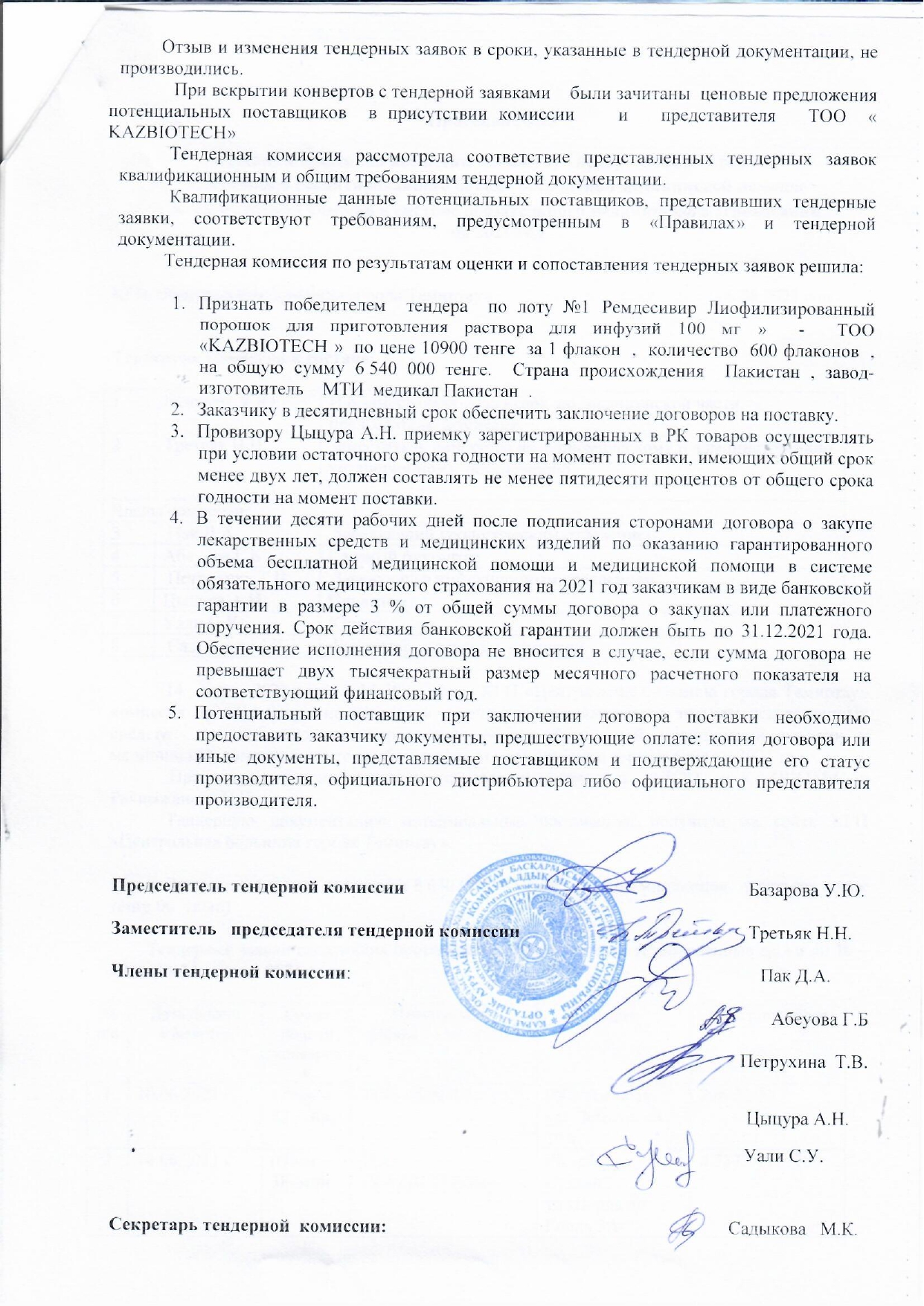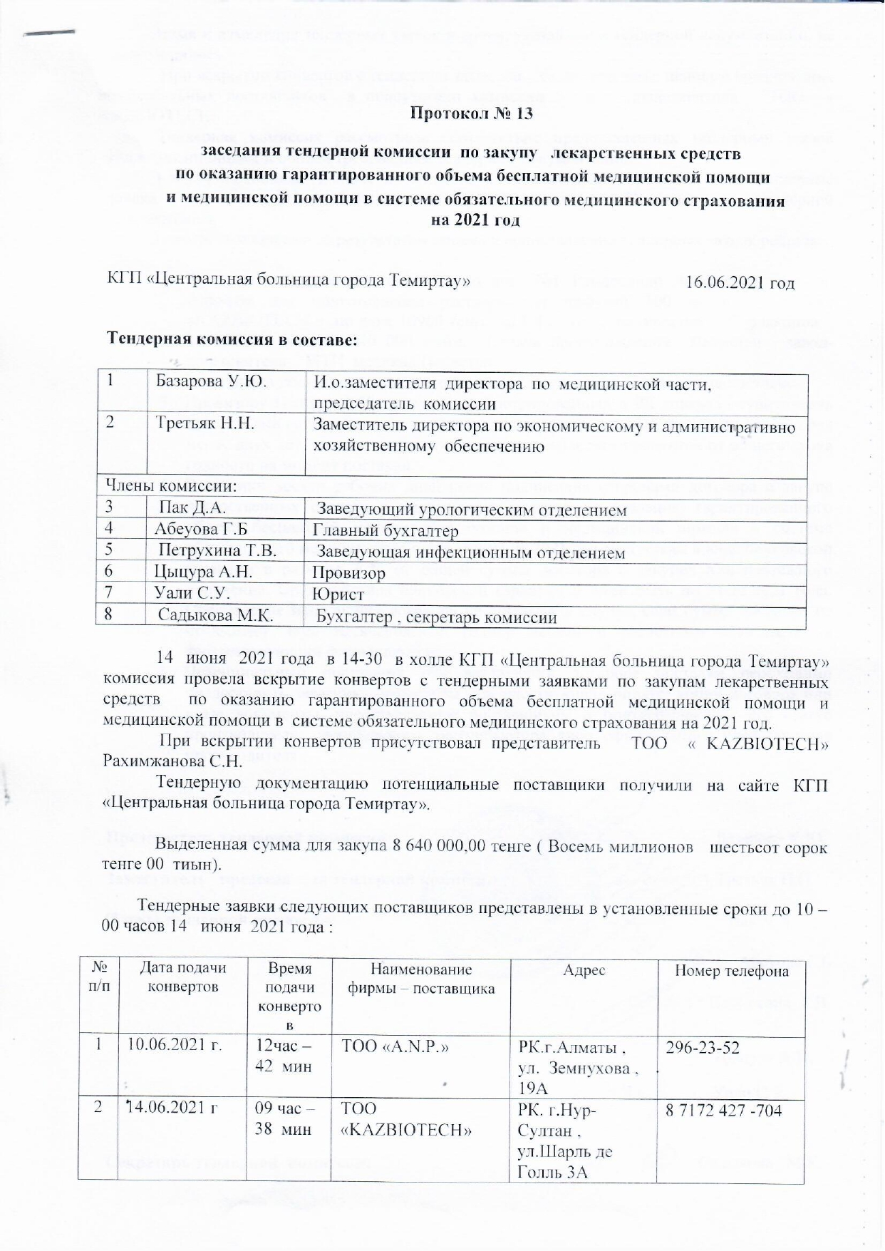 13. Протокол №13 от 16 июня 2021 г. (итоги заседания тендерной комиссии по закупу лекарственных средств)