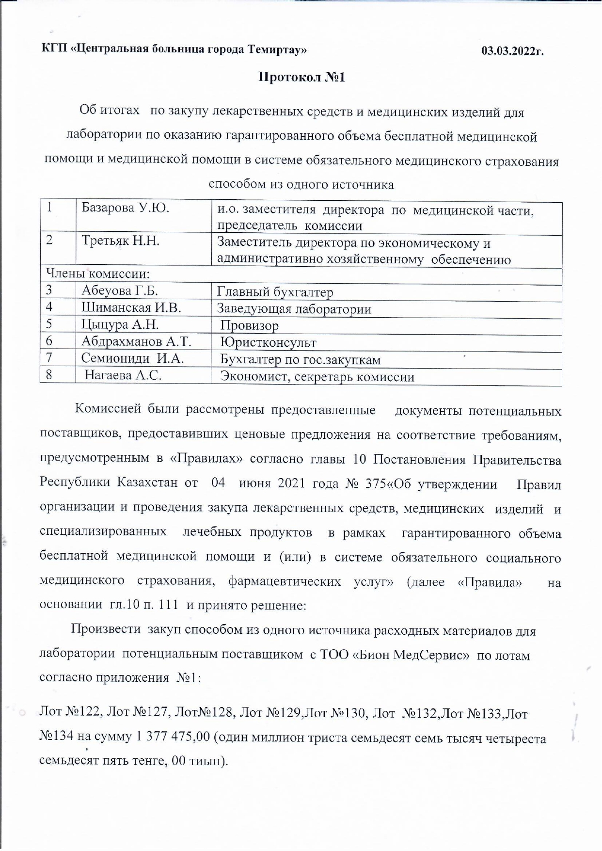 1. Протокол №1 от 03.03.2022 (по закупу медицинских изделий способом запроса ценовых предложений)