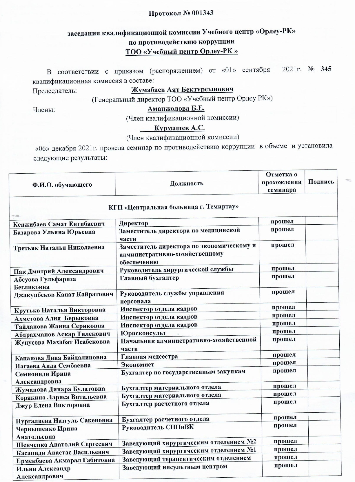 Список телефонов отделений КГП на ПХВ « Многопрофильная больница г.Темиртау» УЗКО