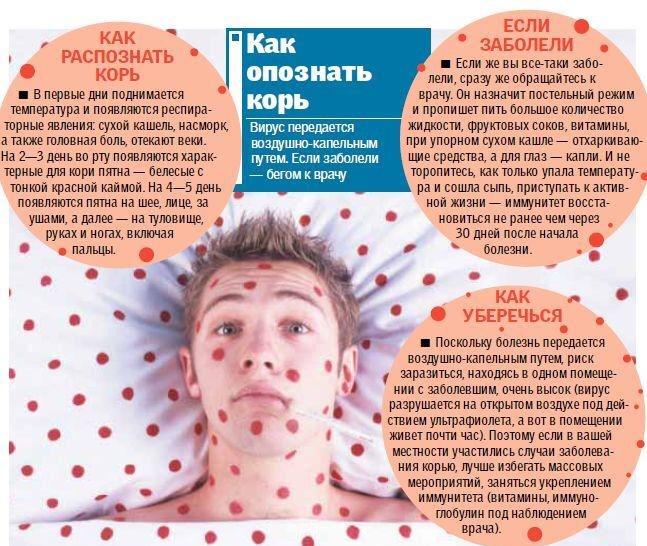 - К мерам профилактики кори также относятся своевременная изоляция больного, медицинское наблюдение за контактными с больным лицами и их своевременная госпитализация (изоляция) в случае заболевания.